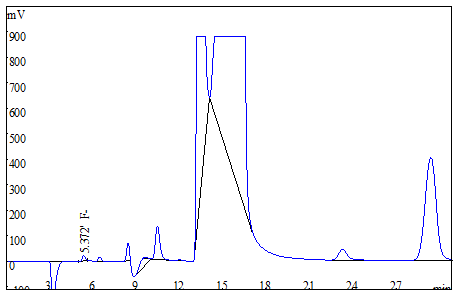 将大米、茶叶试样别离粉粹后过筛,各称取0.25g(切确至0.0001g),于氧弹熄灭仪停止熄灭,冷却后定容,经0.22μm的水系滤膜过滤后上机获得样品谱图,以下图3、图4所示;食用油样品间接称重后停止氧弹熄灭,测试获得的谱图如图5所示;糊口饮用水间接上机后获得样品谱图详见图6。此中大米、茶叶、食用油中氟离子的测定成果均低于体例检出限,同时对4种试样停止了加标处置,加标收受接管率在95.6%~102.3%之间。测试数据详见表2。